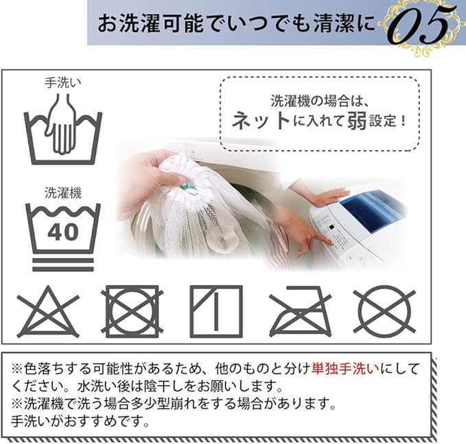 【お洗濯可能でいつでも清潔に】ネットに入れて水洗い、いつでも清潔なスリッパを。 ※色落ちする可能性があるため、他のものと分け単独洗いにしてください。 ※水洗い後は陰干しをお願いします。 ※洗濯機で洗う場合は多少型崩れをする場合があります。手洗いがおすすめです。