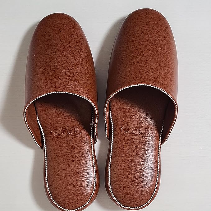 きれいな丸いフォルム。足の負担を軽減する3cm厚みのあるカカト部。高級感があるフェイクレザーを使用。高周波着圧式の最新の技術でしっかりとした作り。来客・来賓用に最適なスリッパ。