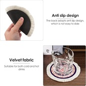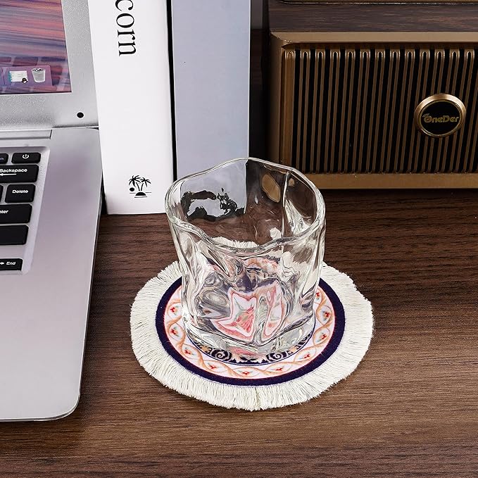 - 鮮やかな色合いと本物の白いタッセルが特徴のこれらのコースターは、マグカップ、カップ、グラスなど、さまざまなサイズや形状の容器に適しています。食卓、バー、コーヒーカウンターなど、どこで使用しても、装飾的なアクセントを加えながら、表面を清潔で乾燥した状態に保ちます。