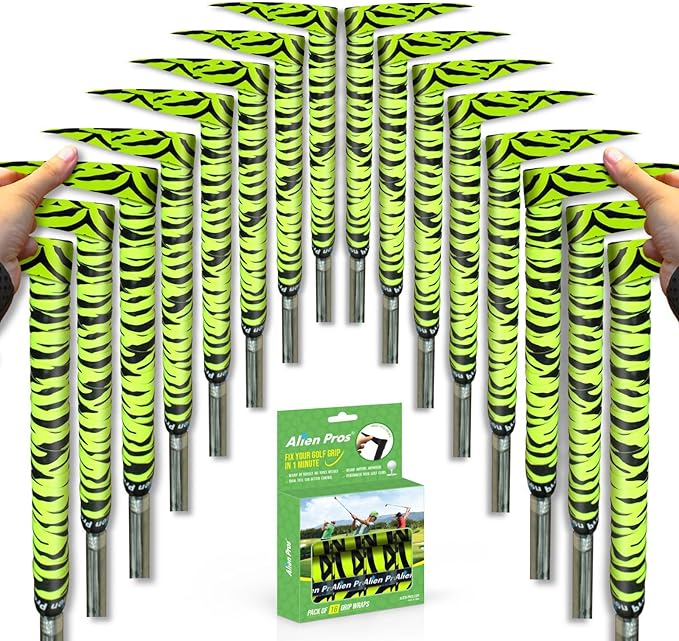 Alien Pros ゴルフグリップラッピングテープ (16枚パック) - 革新的なゴルフクラブグリップソリューション - 1分以内に新鮮なグリップ感をお楽しみください (16枚パック、ネオンタイガー) 持ち直しの手間が終わりました: Alien Pros ゴルフグリップラッピングテープを使えば、剥がして包んで密封するだけで、溶剤やキットは不要です いつでもどこでもリッピングできます お店を訪れる必要はありません 1分もかからないうちに、新しい機能的なゴルフクラブグリップをお好みのスタイルで手に入れることができます 既存のグリップの上に乗る – それを感じてロックする: 世界中の何千人ものゴルフプレーヤーによって証明された新しいリグリッピングソリューション 新しいグリップは汗が吸収され、滑りにくいため、手袋を着用しないでください また、あらゆる天候条件で機能し、かなりの時間持続します Alien Prosで気に入ってもらいたいお金を払い戻すことができます当社は銀河で最高のグリップソリューションになるよう努めています製品に101%満足していない場合は当社にお知らせください ユニークなスタイルを披露: すべてのゴルフクラブが同じように見えることにうんざりしていませんか? 当社の製品で、自分が誰であるかを語る新鮮なクラブスタイルをお選びいただけます 気が変わった場合は、いつでもどこでも自分で簡単にリフレッシュできます 16個入りすべてのクラブとサイズ: 写真に示されているパターンのゴルフグリップラッピングテープが16枚入っています 幅1インチ、長さ47インチ、厚さ0.05インチ 各グリップは吸収性が高く超軽量素材で作られており、すべてのクラブとサイズに対応 - ラップ時にオーバーレイ部分を調節するだけで、グリップの長さと厚さをコントロールできます