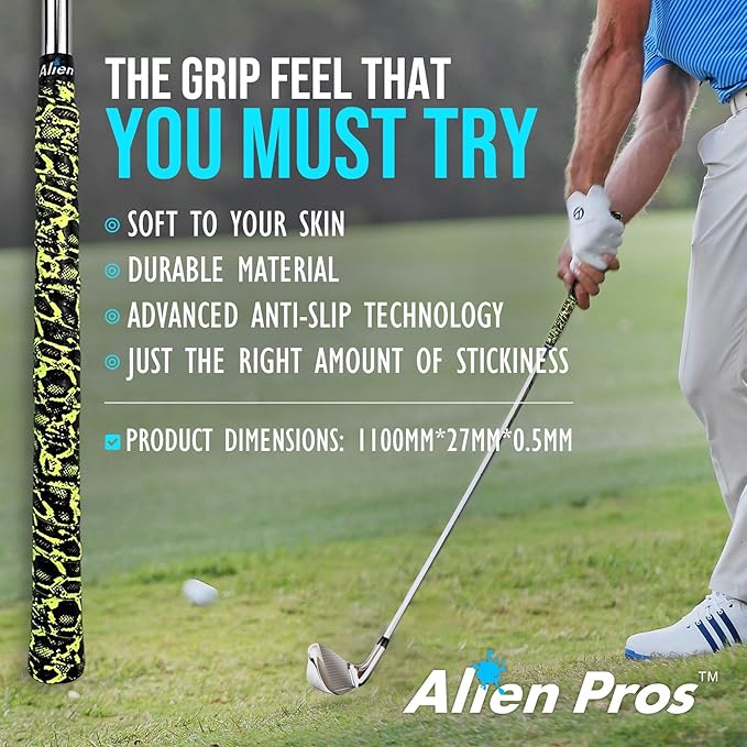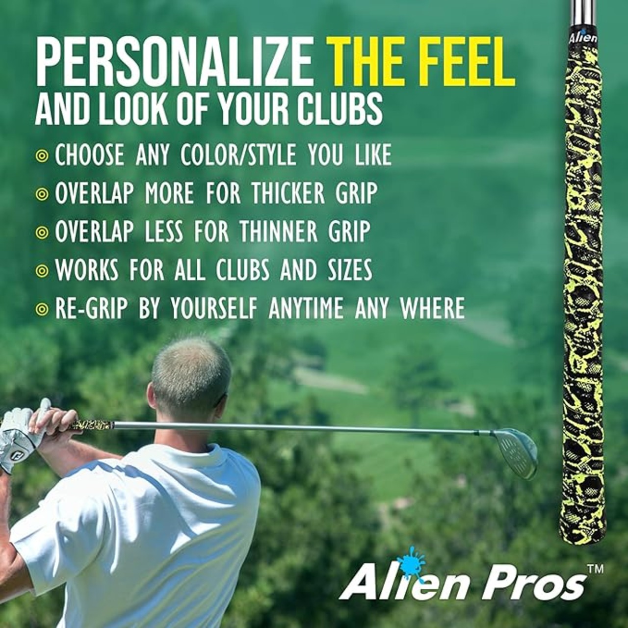 Alien Pros ゴルフグリップラッピングテープ (16枚パック) - 革新的なゴルフクラブグリップソリューション - 1分以内に新鮮なグリップ感をお楽しみください (16枚パック、イエロートカゲ) 持ち直しの手間が終わりました: Alien Pros ゴルフグリップラッピングテープを使えば、剥がして包んで密封するだけで、溶剤やキットは不要です いつでもどこでもリッピングできます お店を訪れる必要はありません 1分もかからないうちに、新しい機能的なゴルフクラブグリップをお好みのスタイルで手に入れることができます 既存のグリップの上に乗る – それを感じてロックする: 世界中の何千人ものゴルフプレーヤーによって証明された新しいリグリッピングソリューション 新しいグリップは汗が吸収され、滑りにくいため、手袋を着用しないでください また、あらゆる天候条件で機能し、かなりの時間持続します Alien Prosで気に入ってもらいたいお金を払い戻すことができます当社は銀河で最高のグリップソリューションになるよう努めています製品に101 Percent満足していない場合は当社にお知らせください ユニークなスタイルを披露: すべてのゴルフクラブが同じように見えることにうんざりしていませんか? 当社の製品で、自分が誰であるかを語る新鮮なクラブスタイルをお選びいただけます 気が変わった場合は、いつでもどこでも自分で簡単にリフレッシュできます 16個入りすべてのクラブとサイズ: 写真に示されているパターンのゴルフグリップラッピングテープが16枚入っています 幅1インチ、長さ47インチ、厚さ0.05インチ 各グリップは吸収性が高く超軽量素材で作られており、すべてのクラブとサイズに対応 - ラップ時にオーバーレイ部分を調節するだけで、グリップの長さと厚さをコントロールできます