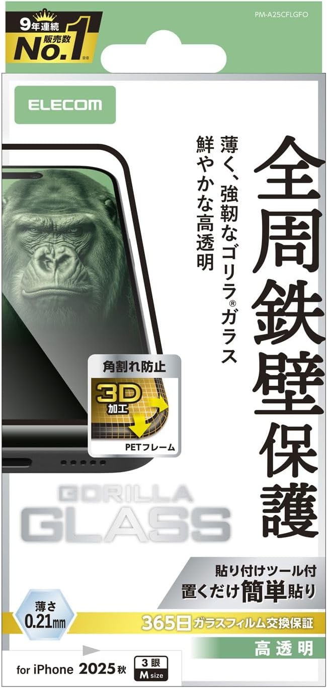 エレコム iPhone 17 Pro ガラスフィルム 光沢 Gorillaガラス 硬度10H フレーム付き 角割れしない 3Dフレーム 衝撃吸収 指紋がつかない 気泡が入らない 【貼り付けツール付き】 [365日交換保証付き] PM-A25CFLGFO | KAZESHOP