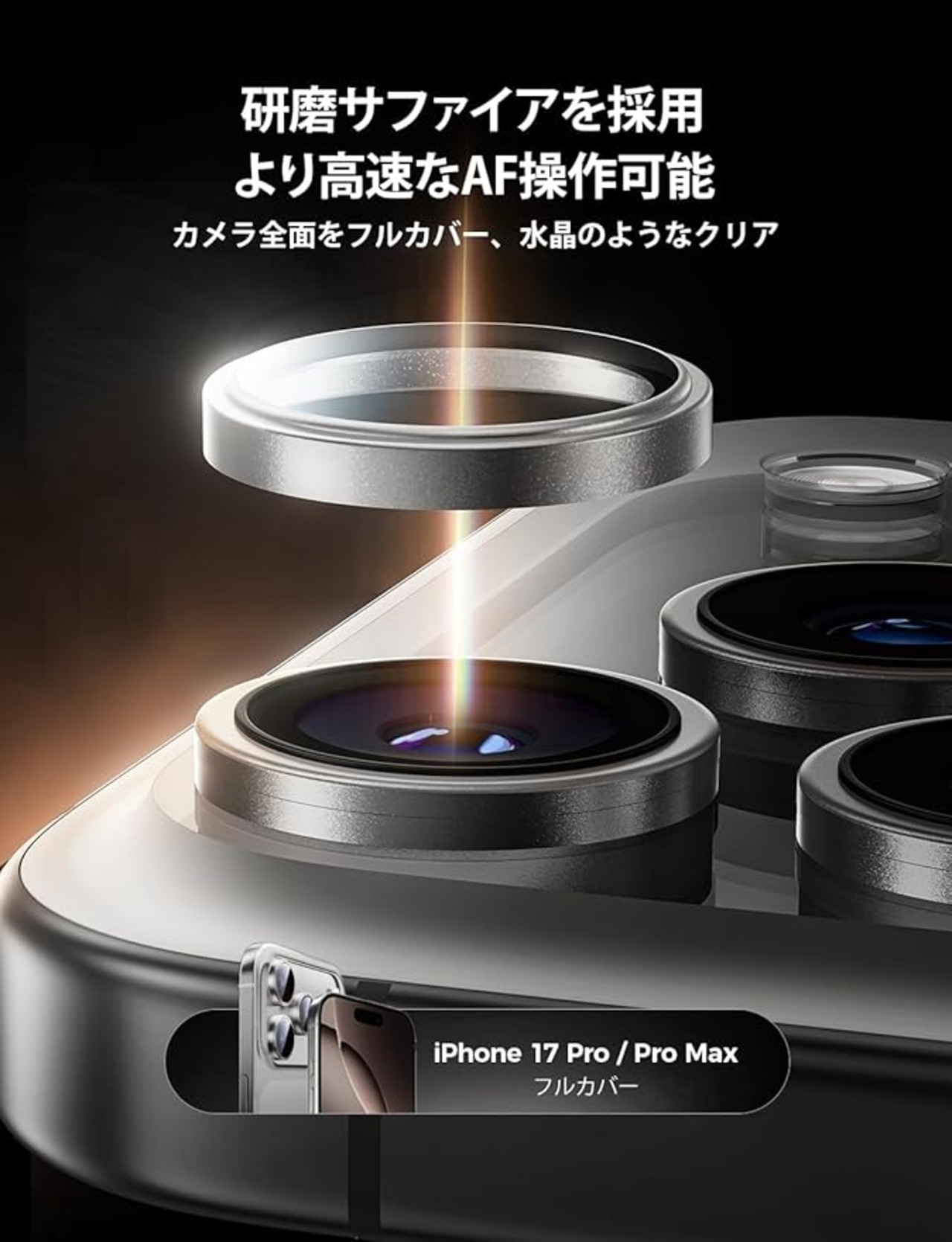 【iPhone 17 Pro/Pro Max専用設計】本品はiPhone 17 Pro/Pro Max専用に開発されております。高精度な1:1加工でカメラレンズにピタリと密着し、すき間なく全面保護します。※他機種へのご利用はいただけません。