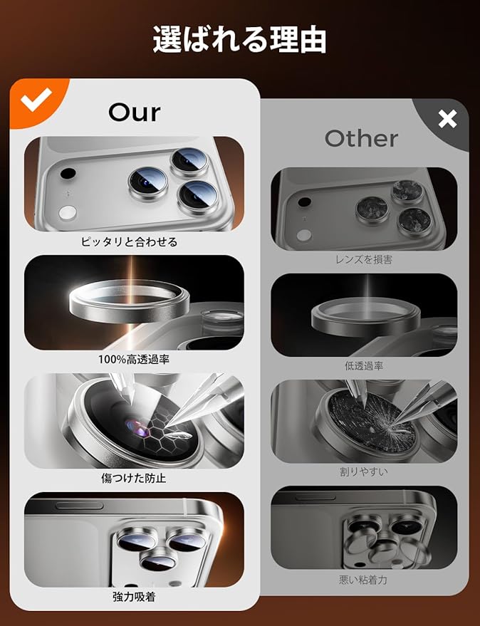 【高透過率99.9%】AR高透過技術を採用し、カメラ本来の高画質をキープ。黒縁を取ることにより、露出オーバーが防止でき、より綺麗な写真や動画を撮影することが可能。
