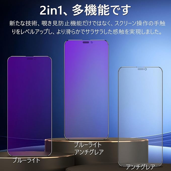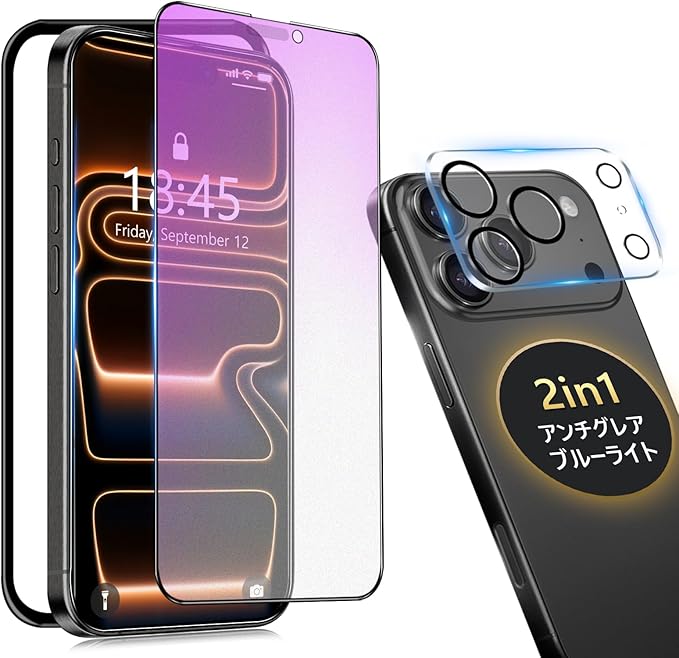 【2in1・多機能】対応 iPhone17Promax (6.9インチ)用、新技術を取り入れた2in1保護フィルムは、アンチグレア+ブルーライトカット機能を兼ね備えています。画面操作時の手触りをさらに改良し、より滑らかでサラサラな使い心地を実現しました。【パッケージ内容】iPhone 17Pro max 用 ガラスフィルム *1枚 + iPhone17Promax 用 カメラフィルム *1枚 + ガイド枠 *1枚。
