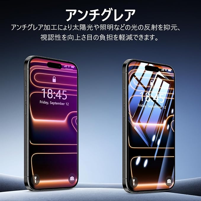 【アンチグレア・指紋防止・高感度タッチ】アンチグレア(非光沢)タイプのさらさらで快適な操作感。光の反射を軽減し、より目に優しくちらつきを抑えます。また、長時間のスマートフォン画面の使用でも目の疲れを軽減することができます。同時に、iPhone17Promax用ガラスフィルムには撥油コーティングが施されており、指紋や汚れなどに強くなめらかな操作感を実現、付着した汚れなどは簡単に拭きとれます。こちらは高耐久撥油コーティングが施され、つるつるな滑り感を実現!ゲームをする人におすすめです。
