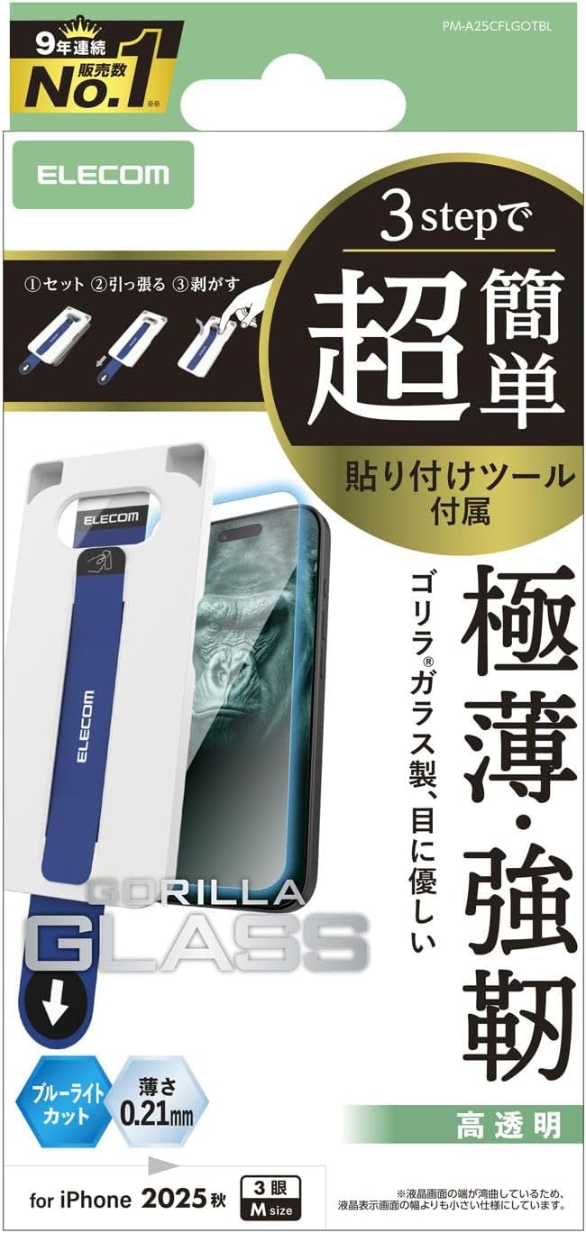 エレコム iPhone 17 Pro ガラスフィルム 光沢 gorillaガラス 硬度10H ブルーライトカット 飛散防止設計 指紋がつかない 気泡が入らない 【簡単貼り付けツール付き】 PM-A25CFLGOTBL | KAZESHOP