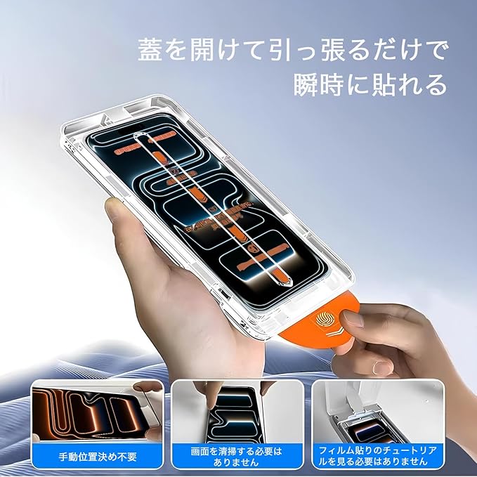 【誰でも失敗ゼロ!貼るだけ簡単】新設計の無塵貼り付けキット付きで、位置ズレ・気泡・ホコリの心配なし。フィルム上部の矢印付きタブをゆっくり引くだけで、自動的に画面に密着し、まっすぐ貼り付け完了。ガイド枠や粘着テープ不要で、初心者でもプロ級の仕上がりに。