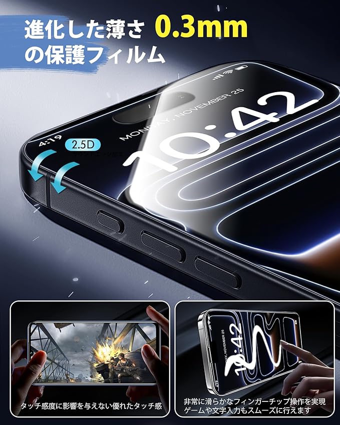 【99.99%光線透過率 一体感抜群!】iPhone 17 液晶画面保護ガラスフィルムは、透き通ったガラスフィルムには多層コーティング技術を採用し、優れた透明度を確保いたしました。これにより、本来の画質を一切損なうことなく、鮮やかな色彩再現性と精細な表示を維持し、美しい画面を忠実に保ち続けます。視覚的なクリアさと没入感をお楽しみいただけます。本体との一体感のあるデザインとなっており、装着後もスマートフォンの美観を損なわず、ケースとの組み合わせにも優れた適合性を発揮します。機能性と美的調和を両立した製品となっております。