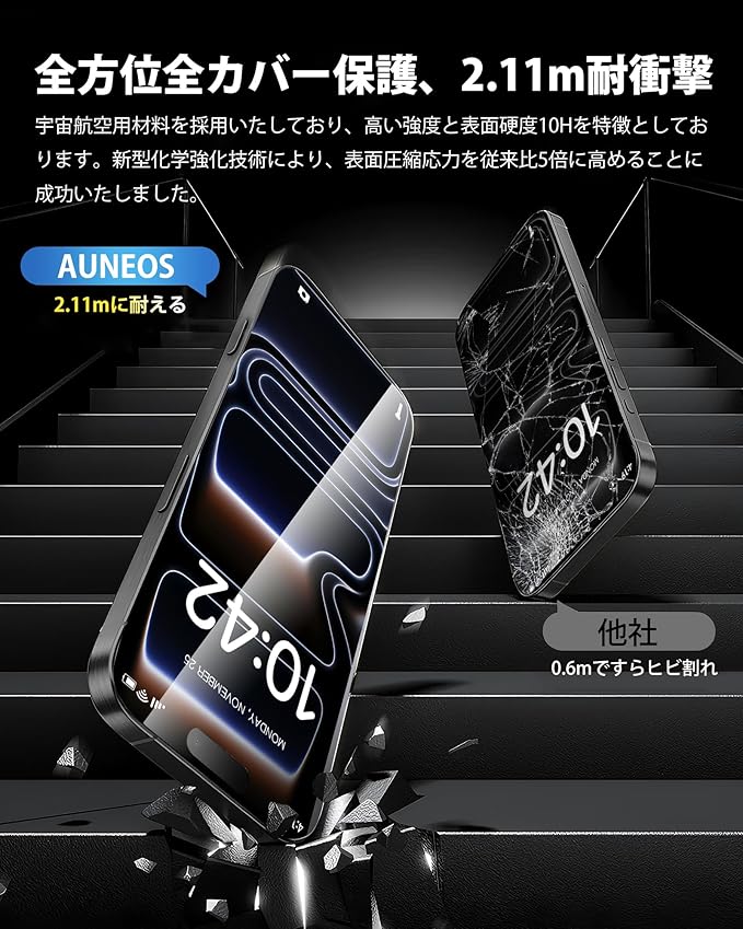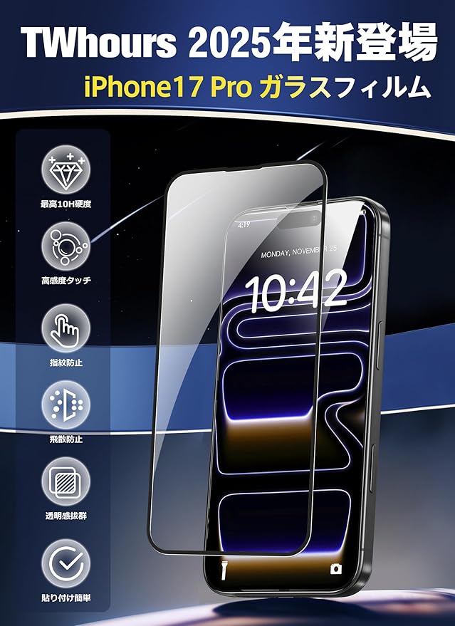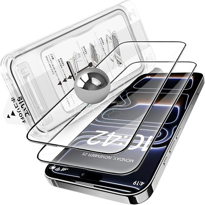 【強化黒縁 10Hの硬度 飛散防止でさらに安心】アイフォン 17 Pro 用ガラスフィルムは、硬度10Hを誇る強化ガラスを採用しており、極細ブラックフレームデザインが曲面に沿って画面全体を覆う設計となっております。一般のガラスと比較して10倍の耐衝撃性を実現いたしました。このような優れた耐久性が高く評価され、擦り傷からスクリーンをしっかりとお守りいたします。外部からの衝撃をフィルムが効果的に吸収し、画面の破損リスクを最小限に抑えます。さらに、特殊な飛散防止構造を採用しているため、万が一スマートフォンをお落としになりガラスが割れた場合でも、破片の飛散を防止する安心設計となっております。どうぞご安心ください。