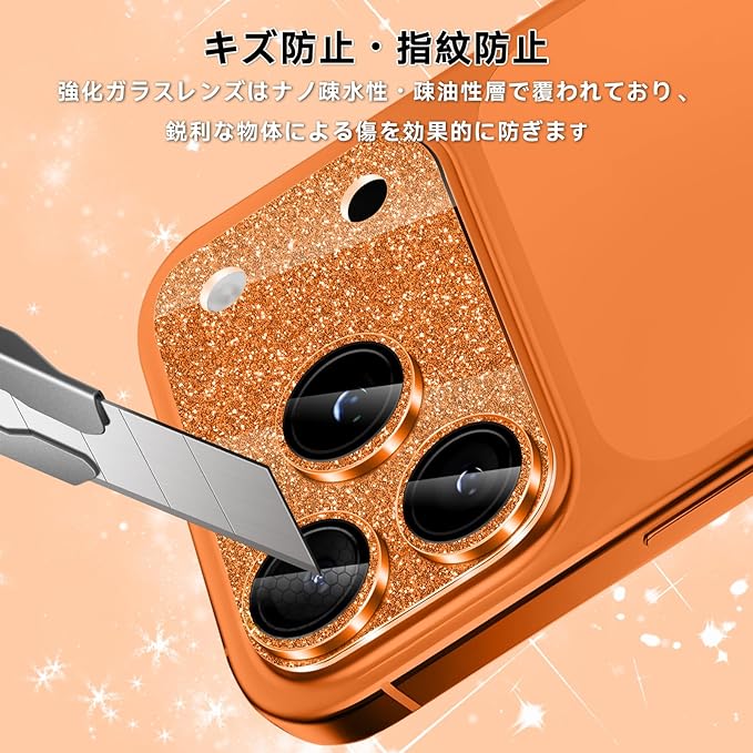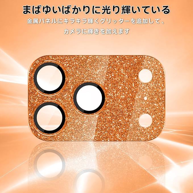 カメラフィルム iPhone 17 Pro(2025) 対応 カメラ保護 強化ガラス+アルミ合金 カメラカバー キラキラ レンズカバー キズ防止 耐衝撃 高透過率 貼り付け簡単 レンズ保護 アイフォン17プロ(2025) 用 (オレンジ) | KAZESHOP
