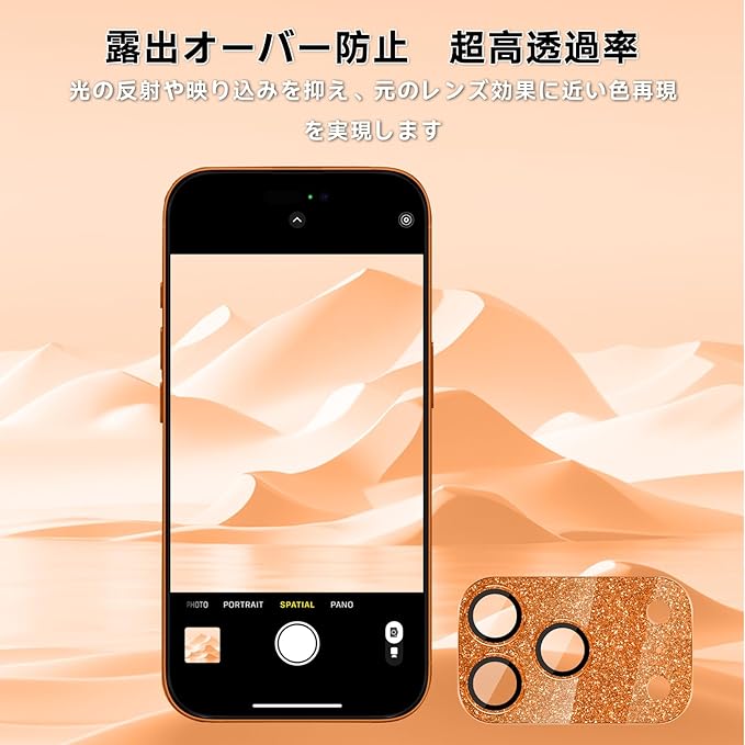 「露出オーバー防止・超高透過率」強化ガラスは光透過率が99%以上あり、撮影時に鮮明で明るい画像を確保し、元のレンズ効果に近い色再現を実現します。レンズフィルムの表面には特殊加工が施され、光の反射や映り込みを抑え、写真本来の質感と奥行き感を保ちます。