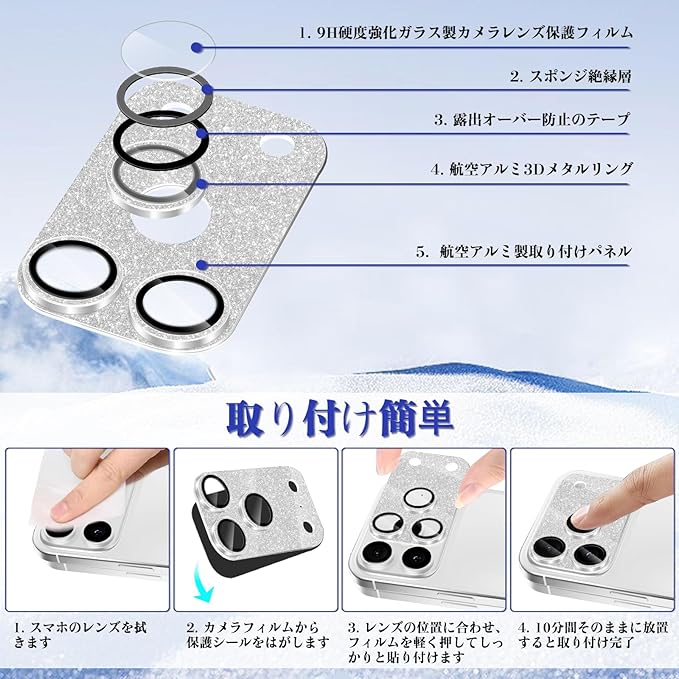 【全面保護】底部にはアルミ合金素材を採用し、レンズ部分に表面硬度9Hの強化ガラスを採用し、カメラのデザインよりも高く、スクラッチ防止し、iPhoneカメラレンズ日常生活の衝撃や損傷から保護します。カメラをしっかりと保護し、バッグやポケット内で発生する可能性のある傷に対して非常に高い耐性を備えています。また、特殊な飛散防止加工により、万一割れてもガラス破片が飛び散ることなく安心です。