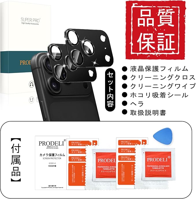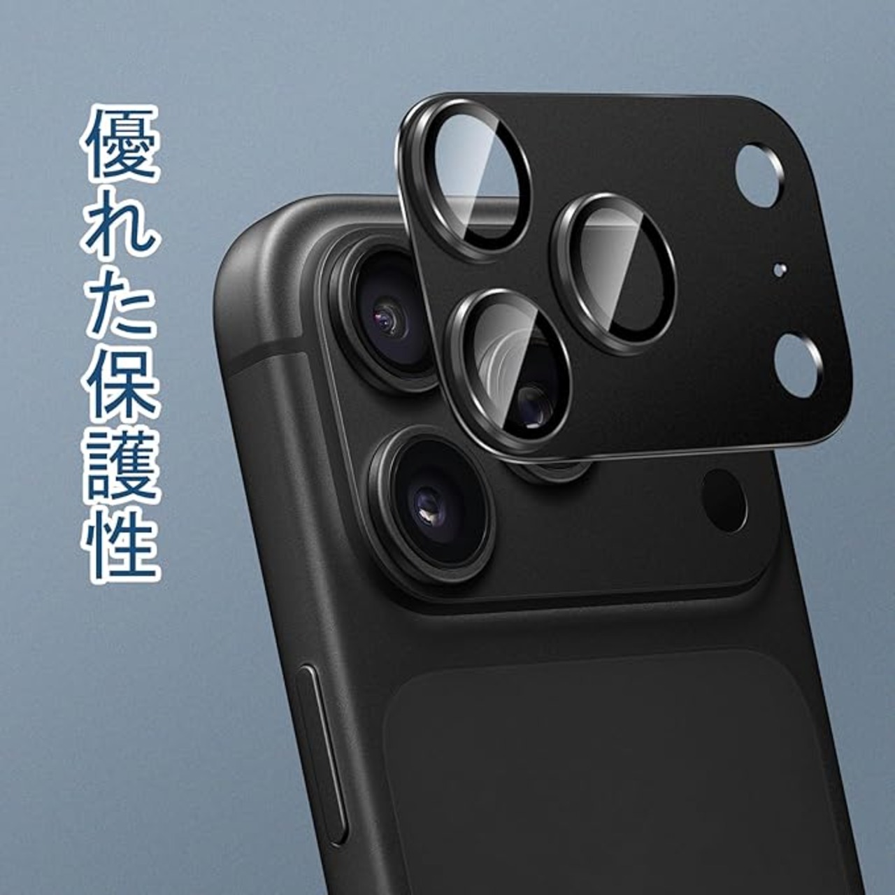 PRODELI For iPhone 17 Pro 専用 カメラフィルム アルミ合金製+AR高透過率 一体型 耐衝撃 硬度9H キズ防止 高透過率 強化ガラス 防爆裂 気泡ゼロ 露出オーバー防止 アイフォン 17 プロ 用 レンズ 保護フィルム (ブラック/2枚入り) | KAZESHOP