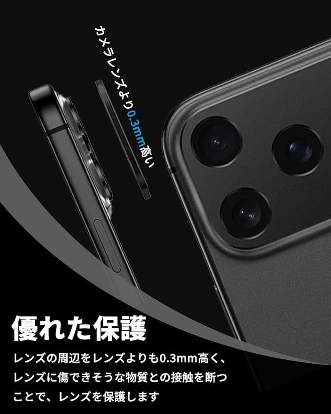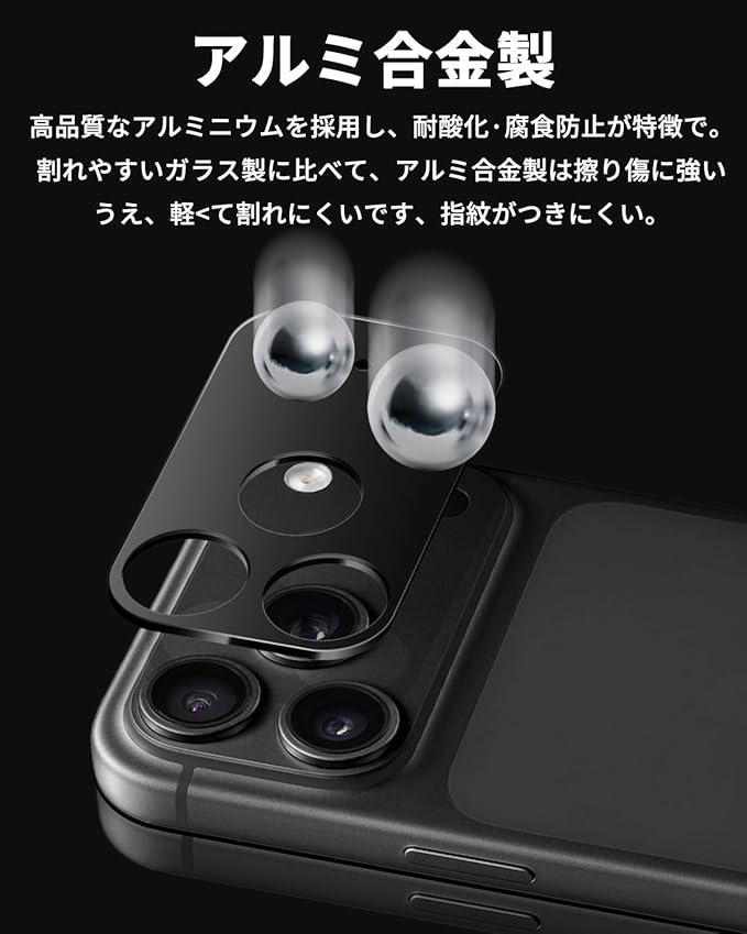 【アルミ合金一体感】アルミ合金素材を採用して、ガラス製カメラフィルムより軽い上に割れることもなく、指紋も付きにくいです。さらにアルマイト処理が施されているので、耐摩耗性にも優れています。縁部分も含め、精確なサイズにカービングされているので引っかかる感じがなく、ほとんどのケースとも干渉しません。 本体のレンズ部分と完全に融合し、違和感がなく、一体感と高級感に満ちています。