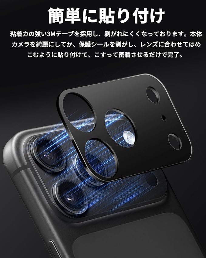 【貼り付け簡単】粘着力の強い3Mテープを採用しており、アイホン17 pro 本体カメラを綺麗にしてから、保護シールを剥がし、レンズに合わせてはめこむように貼り付けて、しっかりとこすって密着させるだけで完了。また、嵌め込み式であるため、より剥がれにくくなっています。