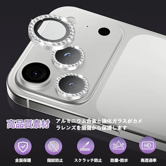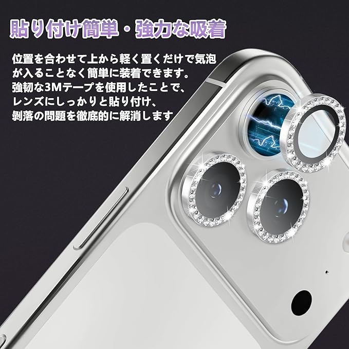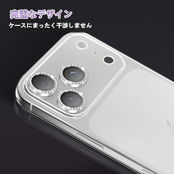 iPhone 17 Pro/17 Pro Max 対応 カメラフィルム ラインストーン レンズ キラキラ 可愛い 3Dデコレーション アイフォン17 pro 保護フィルム 独立型 カメラ保護カバー 高透過率 露出オーバー防止 キズ防止 耐衝撃 全面保護 iphone 17 pro max レンズフィルム (シルバー) | KAZESHOP