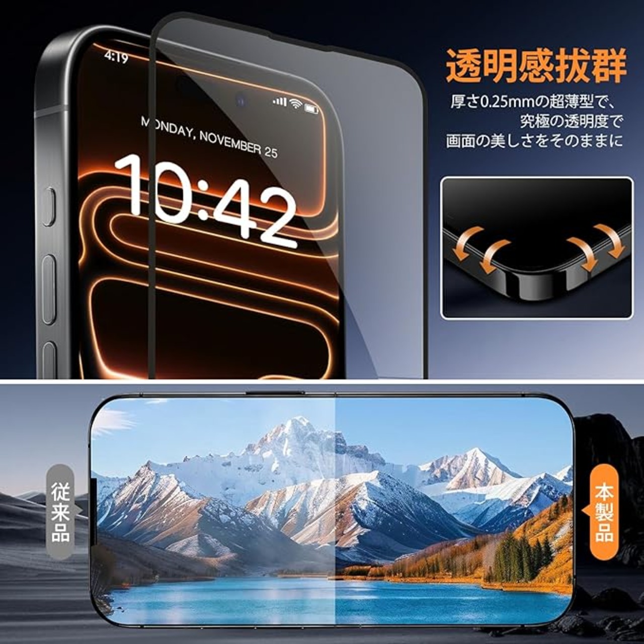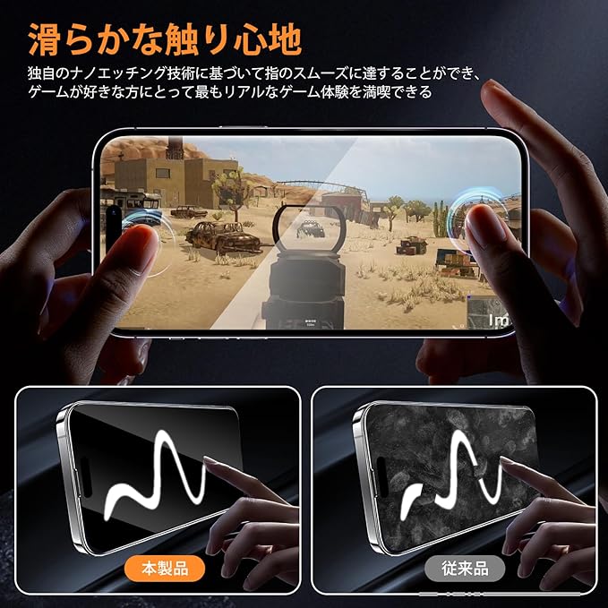 【高透過率・高感度タッチ】新たに升級した光学投影技術により、光透過率は約99.9%を実現。画面の色味や解像度を損なわず、まったくのロスレスな視覚体験をお届けします。0.25mmの極薄ガラスを使用、スクリーンを元々の高感度タッチを保ちます。高感度のフィードバックで遅延なく、100%正確迅速な対応できます、スムーズな操作感を実現できます。「使い勝手が落ちる」と心配されるスマホ裸族の方にも安 心してご使用いただけます。