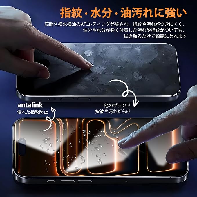【一体感抜群!指紋防止 撥水撥油】対応 いphone 17 Pro Max ガラス保護フィルムの黒縁の精巧な2.5Dラウンドエッジ加工により、ガラス側面の引っ掛かり感がなく純正を超える手触りを実現しました。スマホの本体デザインを損なわず、ケースとの相性も抜群です。保護膜は石材ナノコーティングの最新指紋防止技術、防水撥油コーティングを使用し、汗、油汚れ、指紋付着を効果的に防止する、携帯電話の画面をきれいに保つことができます。