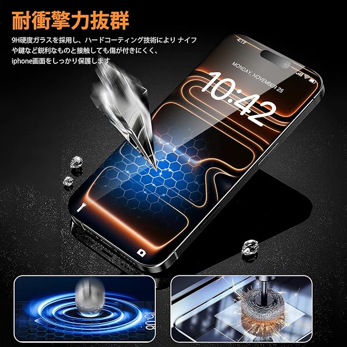 【10H硬度・飛散防止】対応 アイフォン 17 プロマックス ガラスフィルムは10H硬度の強化ガラスを採用。ナイフや鍵などの鋭利な物品と接触しても傷つきにくく、画面を強力に守ります。また、スマホ画面保護フィルムは特殊な飛散防止設計により、万が一割れても破片が飛散せず、安全性が極めて高いのも特長です。スマホの画面保護とユーザーの安全を両立しました。