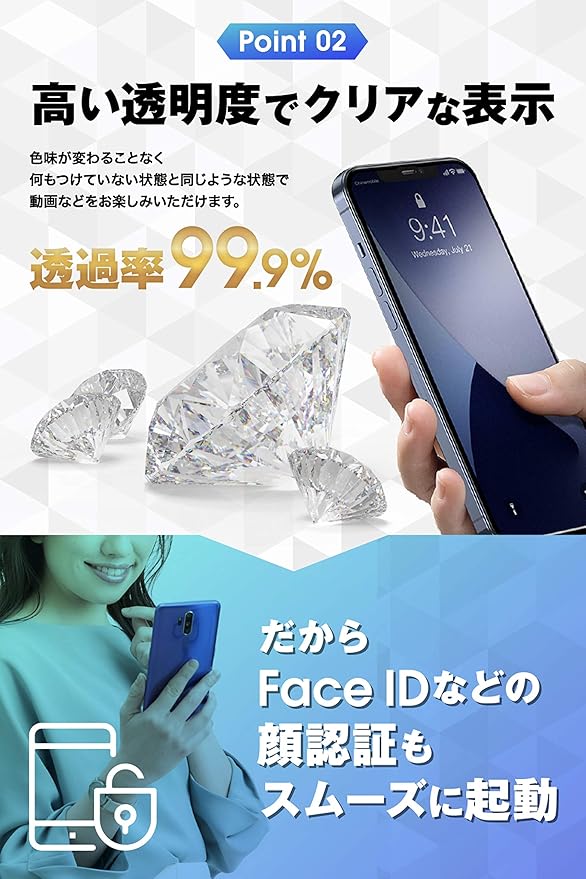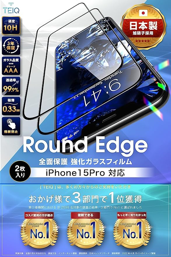 ✅【 信頼度の高いジャパンクオリティ 日本製 旭硝子採用 】 TEIQ の ガラスフィルム は外国製の粗悪なガラス ではなく、品質グレードAAAの『高品質』の日本メーカー 旭硝子製の 硬度 10H の 強化ガラスフィルム を採用しています。 透過率は『99.9%』と何もつけていない状態と間違うほどの透明感を実現。 さらに、指紋・汚れが付着しにくい 『 指紋防止 コーティング』を施し、滑らかな表面となっているので汚れから守りながらもより良い操作性を実現した 液晶保護フィルム です。