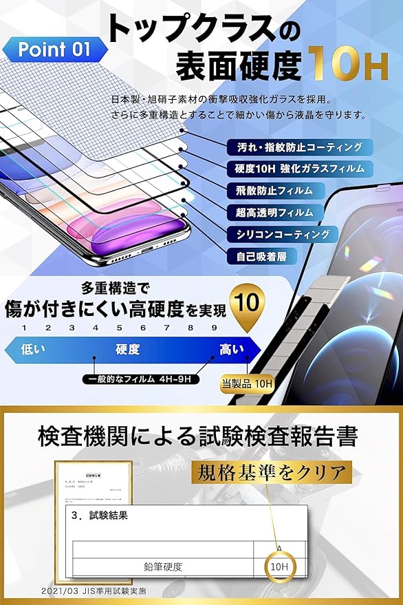 特徴 10H 表面硬度, フルカバレッジ, ラウンドエッジ, 耐傷性, 耐汚性