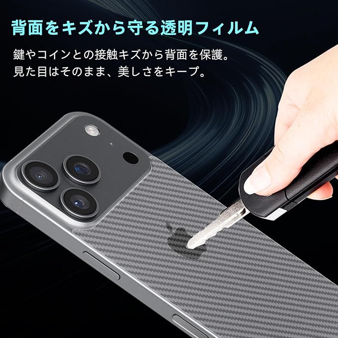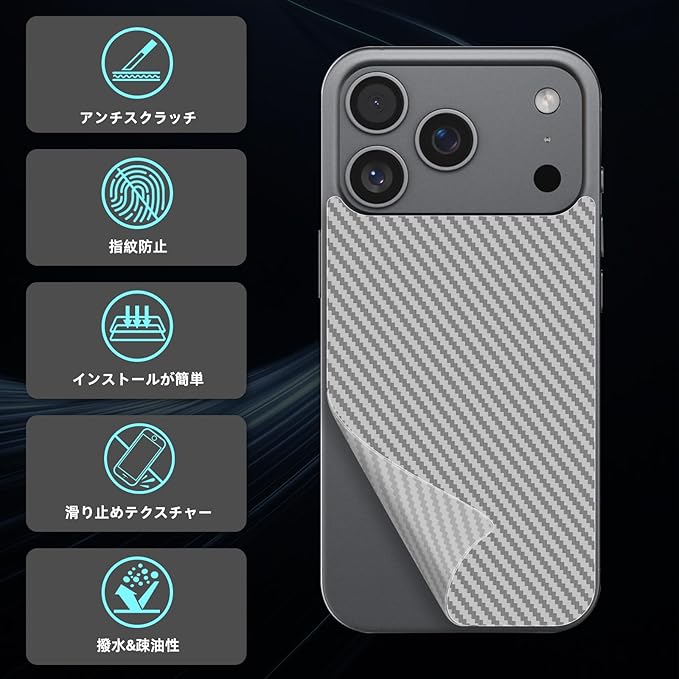 【対応機種】いPhone 17 Pro Max 対応 炭素繊維素材フィルムです。【パッケージ内容】背面フィルム*3枚、クリーニングキット*3枚、スクラッチカード*1枚