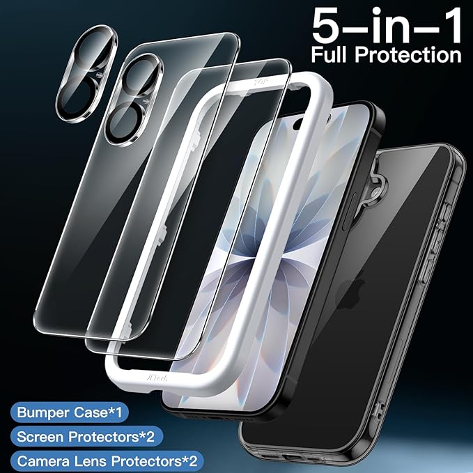JETech 5 in 1 iPhone 17 6.3インチ用 ケース 2枚強化ガラスフィルム+2枚カメラレンズフィルム付き 黄ばまない 耐衝撃バンパースマホカバー (ブラック) | KAZESHOP