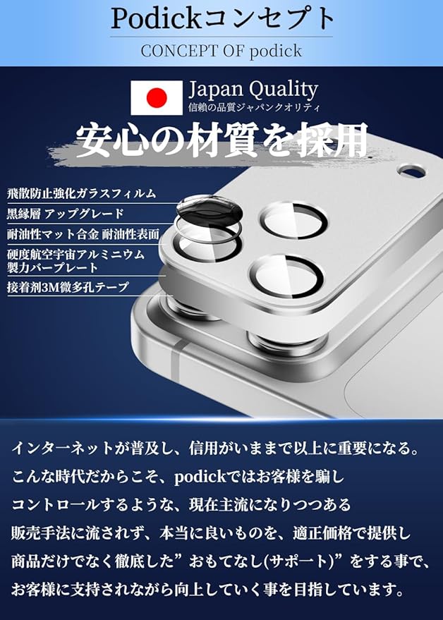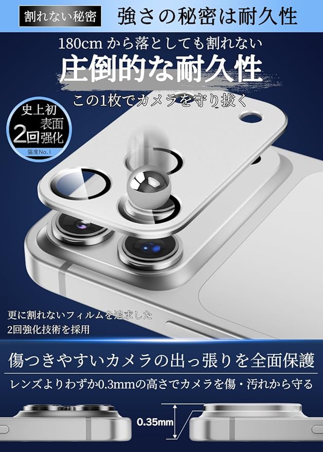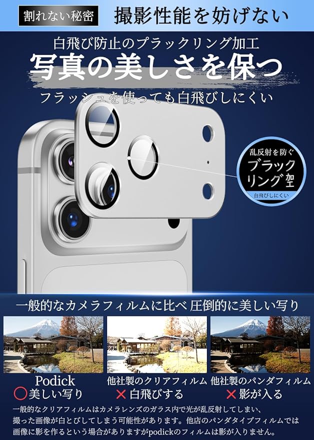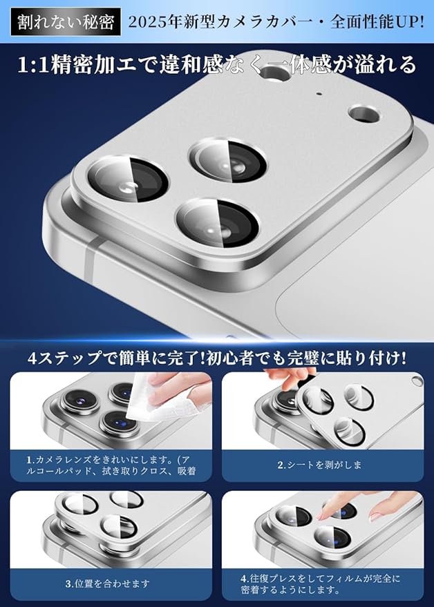 【対応機種・貼付け超簡単】iPhone 17 Pro 専用カメラレンズプロテクター。フィルム接着面にはナノ静電吸着技術を処理され、位置を合わせて置くだけで簡単に貼り付けます。誰でも気泡なく、綺麗に貼り付けます。※品質保証付き:当店でご購入の製品は1年間の保証サービスをご提供しております。『初期不良の場合』『違う商品が届いた場合』『ヒビ入り/割れた場合』、注文履歴からお問い合わせください。お客様からのお問い合わせ内容に応じて返金対応を提供いたします。