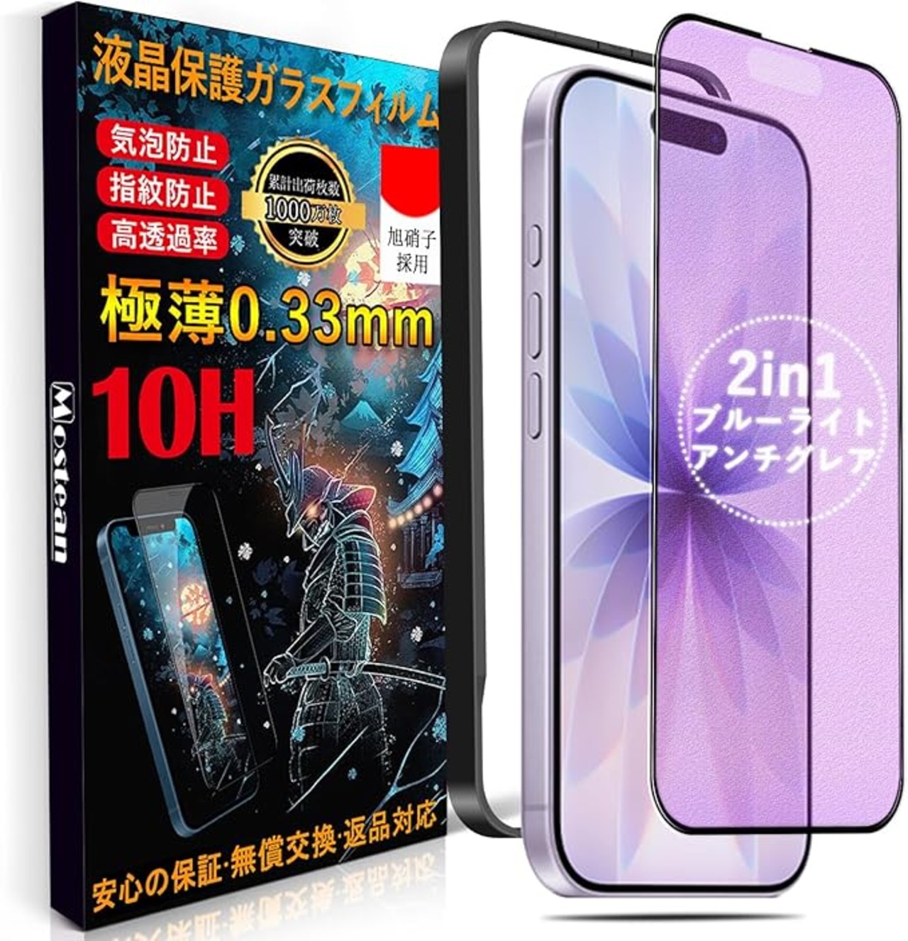Mostean【アンチグレア + ブルーライトカット】 対応 iPhone17 / 対応 iPhone16 Pro ガラスフィルム ブルーライトカット アンチグレア いPhone17/いPhone16 Pro 保護フィルム 目の疲れ軽減 反射防止 指紋防止 貼り付け簡単 ガイド枠付き アイフォン17/アイフォン16 Pro フィルム【 6.3インチ】 | KAZESHOP