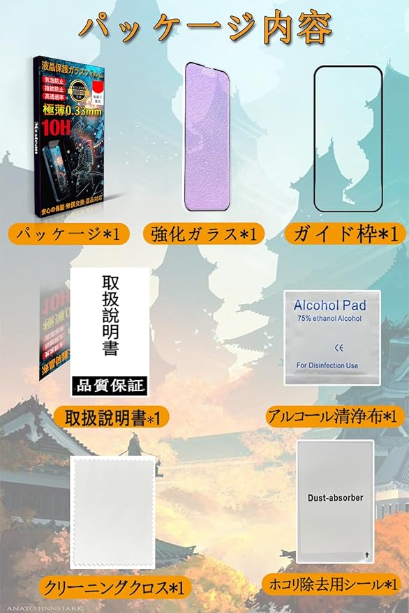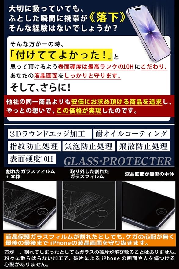 【旭硝子素材採用・最強硬度10H・飛散防止】ガラスフィルム一般的な液晶保護フィルムの約6倍の強度。衝撃は強化ガラスに吸収されますので、ディスプレイにかかる衝撃負荷を軽減し。ディスプレイが破損することを防ぎます。万が一の破損時も飛散防止加工によって破片はフィルムに張り付いた状態で破片がほとんど飛び散らない安全性の高いガラスになっています。