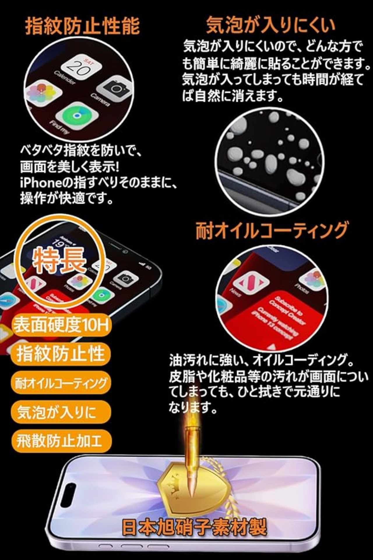 【快適なタッチ感!指紋防止 撥水撥油技術】真空蒸着技術を利用し、表面にナノコーティングを採用し、指紋防止薄膜を形成することで、滑らかであると同時にパワフルな耐油汚れ・汗染み・指紋性能を備え、汚れ防止効果はより長く持続でき、頻繁にスマホを拭く悩みがなくなります。