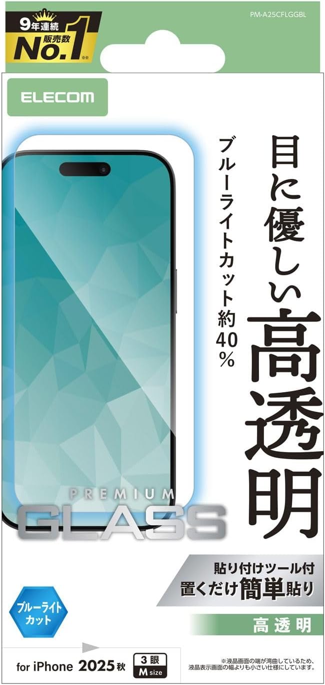 エレコム iPhone 17 Pro ガラスフィルム 光沢 強化ガラス 硬度10H ブルーライトカット 飛散防止設計 指紋がつかない 気泡が入らない 【貼り付けツール付き】 PM-A25CFLGGBL | KAZESHOP