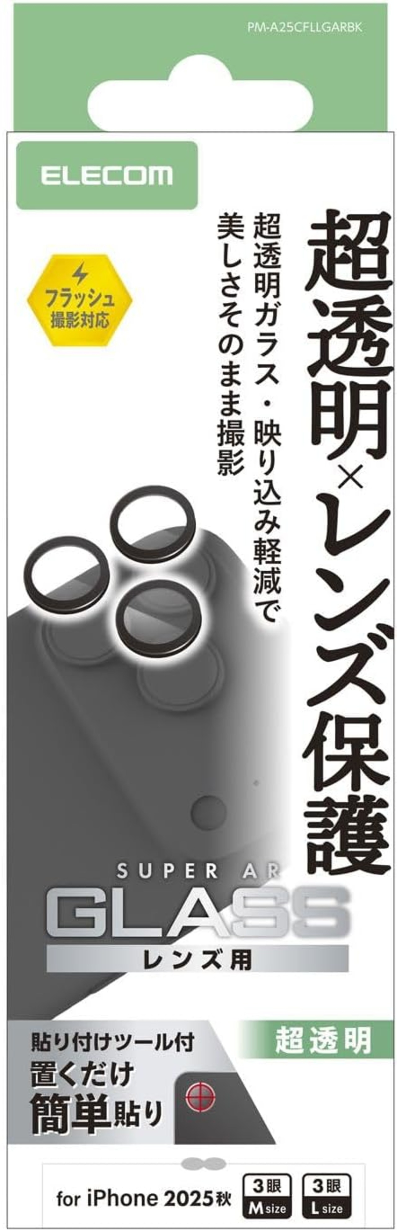 エレコム iPhone 17 Pro カメラフィルム 光沢 強化ガラス 硬度10H ARコート 指紋がつかない 気泡が入らない 飛散防止設計 【貼り付けツール付き】 ブラック PM-A25CFLLGARBK | KAZESHOP