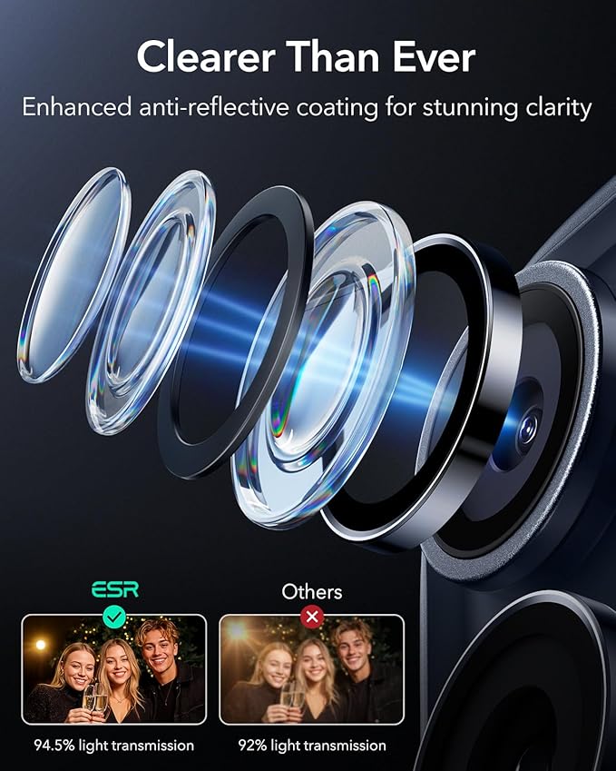 【高度AR反射防止】高度なAR技術と内蔵アンチグレアリングを採用し、スマートフォン本来のカメラ本来の色彩コントラストと鮮明さを維持しながら、映り込みを軽減。元のカメラの画質を完璧に再現します。これにより、昼夜を問わず、より明るく鮮明なポートレートを撮影でき、あらゆるディテール、色彩、そして瞬間を捉えることができます。また、傷や摩耗からスマートフォンのレンズを保護し、デバイス寿命を延ばします