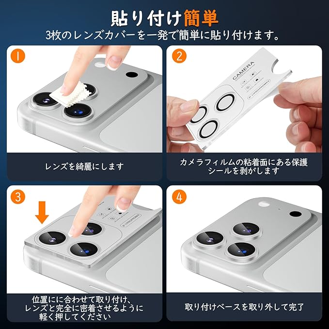 【対応機種】iPhone 17 Pro/17 Pro Max専用カメラフィルム。【貼ってる感ゼロ!】iPhoneレンズそのもののデザインに融け込み、貼ったままでも装着感ゼロ。iPhoneの美しさをそのままに、最高の保護を。