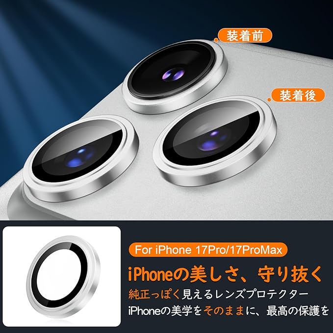 レンズカバー iPhone 17 Pro/17 Pro Max 用 カメラフィルム 【貼ってる感ゼロ!】 9H強化ガラス アルミ合金 耐衝撃 いphone17pro/17pro max カメラ保護 高透過率 キズ防止 露出オーバー防止 気泡ゼロ 指紋防止 貼り付け簡単 アイフォン17プロ/17プロマックス 対応 独立型レンズプロテクター (17Pro/Max,Silver) | KAZESHOP
