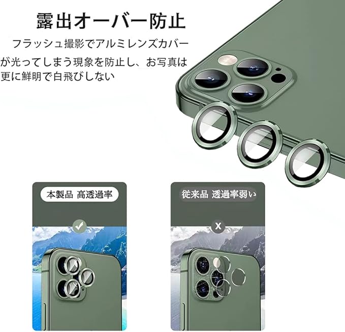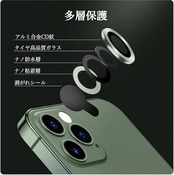 【対応機種・最高保護】レンズ保護フィルム iPhone 13 Pro/iPhone 13 Pro Max用カメラフィルム(グリーン)(3枚) 専用カメラレンズ保護フィルム。iPhone13/iPhone13Miniに対応しません。衝撃に強いアルミ合金製+日本製9H強化ガラスの組み合わせ、最高な保護力を提供しています。擦り傷や衝撃からカメラレンズをしっかりと守られます。
