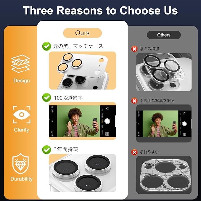 5. ⚡【 薄いのにしっかり守る!安心の保証付き】: 他のカメラ保護フィルムと比較して、当製品は**薄**でありながら、**一体型**設計により17 Proにぴったりフィット。これにより、薄さと保護力のバランスが取れ、レンズをしっかり守りつつスマートで洗練された外観を提供します。さらに、6ヶ月間の品質保証がついており、万が一の初期不良や破損時には返金や交換対応が可能です。安心して長期間お使いいただけます。