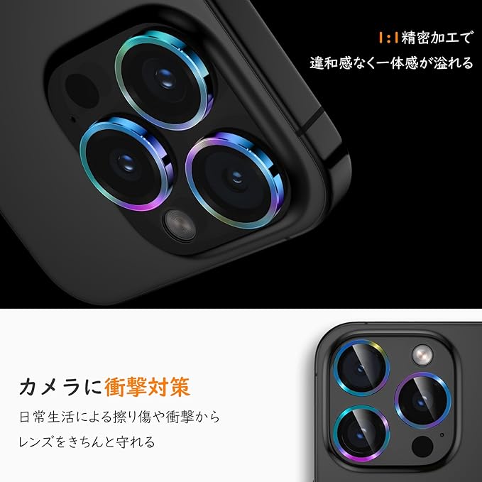 【スマホケースと干渉せず・0.2mm極薄型】本体に沿って精密に設計され、カメラレンズにピッタリとフィットし、引っかかり感がなく、ほとんどのケースと干渉しません。フィルム貼付後に、カメラレンズよりわずか0.2mm高くなっている。さらに、スマホと同じの配色で、いPhone本来の崇高な美しさと高級感を損なわなく、いつものスマホに上品さをプラス。