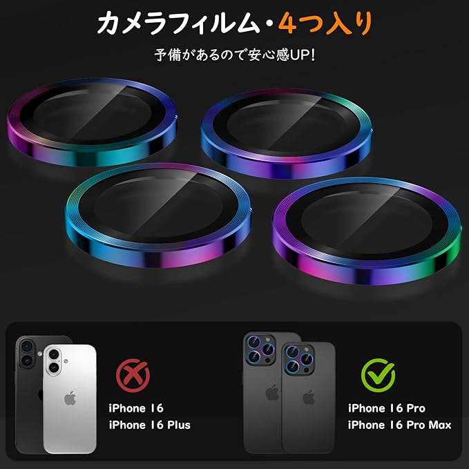 【4枚入り】レンズカバー iPhone16 Pro/16 Pro Max用 カメラ保護 9H強化ガラス アルミ合金 アイフォン16Pro/16Pro Max カメラフィルム 耐衝撃 露出オーバー防止 黒縁取り 超高透過率 いphone16pro/いphone16プロ max カメラカバー プロテクター カラフル | KAZESHOP