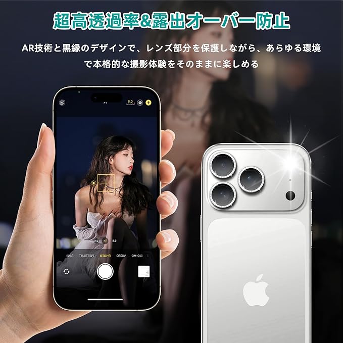 【優れた材質】 本製品は高品質のアルミ合金と9H強化ガラス製なので、レンズフィルム全体に優れた耐衝撃性を持たせ、落下時のカメラへの衝撃を緩和します。傷も付きにくくてナイフや鍵などの尖ったものからガラスをしっかり保護できます。そして、防塵、剝落防止、撥水撥油も実現できます。さらに、はめ込まれたラインストーンが太陽や光の下で、目を奪うような輝きを放ち、キラキラしていて非常に華やかで、洗練されていて、細部から一風変わったセンスが現れて独特なスタイルを実現します。