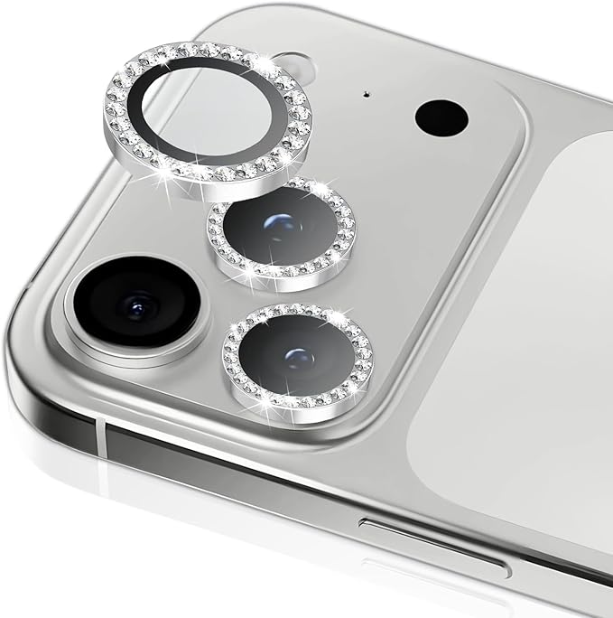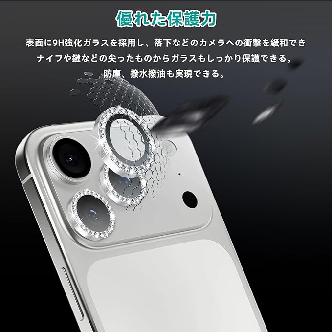 カメラフィルム iPhone 17 Pro/17 Pro Max対応 レンズフィルム アイフォン 17 プロ/17 プロ マックス 用 キラキラ ラインストーン付き レンズ カメラカバー レンズプロテクター アルミ合金 & 9H強化ガラス製 独立型 露出オーバー防止 高透過率 耐衝撃 キズ防止 カメラ保護フィルム iPhone 17 pro/17 pro max 用 シルバー | KAZESHOP