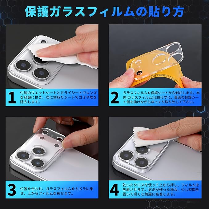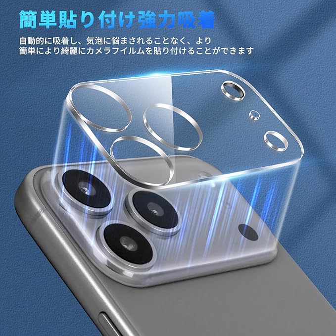 【貼付け超簡単 ・気泡レス!】対応 iPhone 17 Proカメラ保護カバーフィルムの粘着面はナノ静電吸着技術を処理され、レンズに合わせてはめこむように置くだけで、気泡も浮きもなくきれいに貼り付けることができます。初心者の方でも簡単に綺麗に貼り付けます。