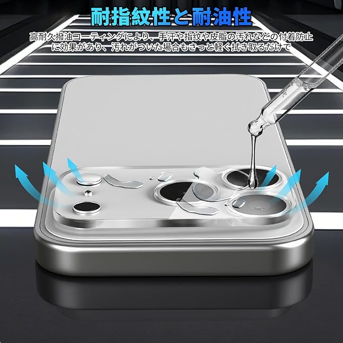【全面保護・防滴防塵】対応 iPhone 17 Pro レンズフィルムは3眼のレンズ部分だけではなく、四角い台座部分もカバーする一体型のデザインで、レンズに最高な保護力を提供しています。広い面を覆うため、カバーの密着度合いが非常に高くて、レンズのみのカバーと比較して防塵効果も高くて、ホコリが入りにくい構造です。