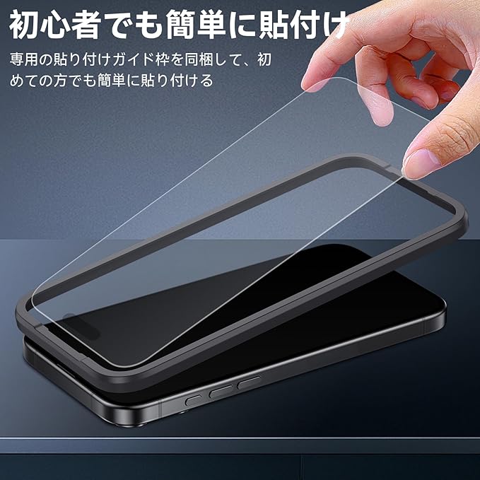 【初心者でも貼り付け簡単】初めての方でも簡単に貼り付けられるよう、専用の貼り付けガイド枠を同梱しています。携帯本体と保護フイルムがズレることなく、だれでも簡単にガラスフィルムを貼ることができます。