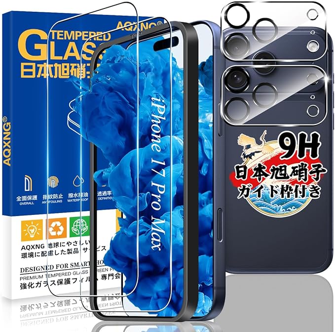 【ガイド枠付き】 対応 iPhone 17 Pro max ガラスフィルム 2枚 + カメラ保護 2枚 【4枚セット 日本旭硝子製】 いphone17promax 用 フィルム 強化ガラス アイホン17pro max 用 保護フィルム ケース 硬度9H 耐衝撃 飛散防止 高感度タッチ 指紋防止 撥油性 疎水性 自動吸着 気泡ゼロ 貼り付け簡単 | KAZESHOP
