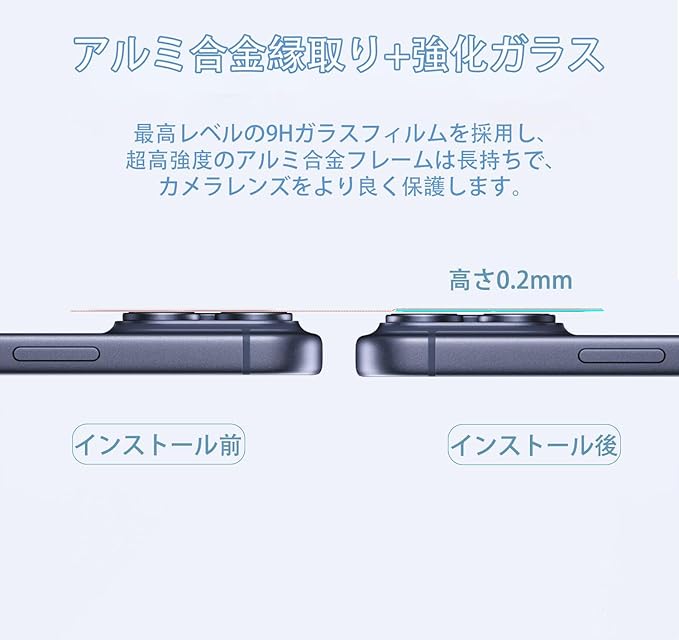 【3D全面保護】 底部にはアルミ合金素材を採用し、レンズ部分に表面硬度9Hの強化ガラスを採用、カメラのデザインよりも高く、スクラッチ防止し、iPhoneカメラレンズを衝撃や通常の損傷から保護します。スマートフォンを落とした場合でも、保護フィルムが側面からの衝撃を吸収し、カメラレンズへの傷や衝撃を最大限に防ぎます。