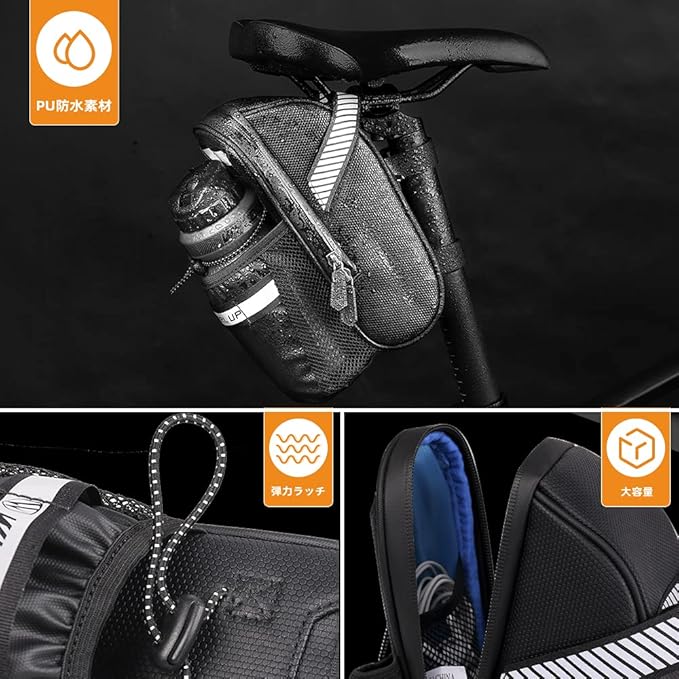 【防水 耐久】この自転車 バックの素材は防水対応かつ防水ジッパー仕様ので突然の雨でも安心です。コーティングが施されているので泥を染み込まず、拭けば綺麗になります。また、バッグやマジックテープの素材がやわらかいため、収納したアイテムをキズつけにくいです。手軽にサドルバッグを使いたい人にぴったりです。生地はしっかりしていて耐久性もあります。