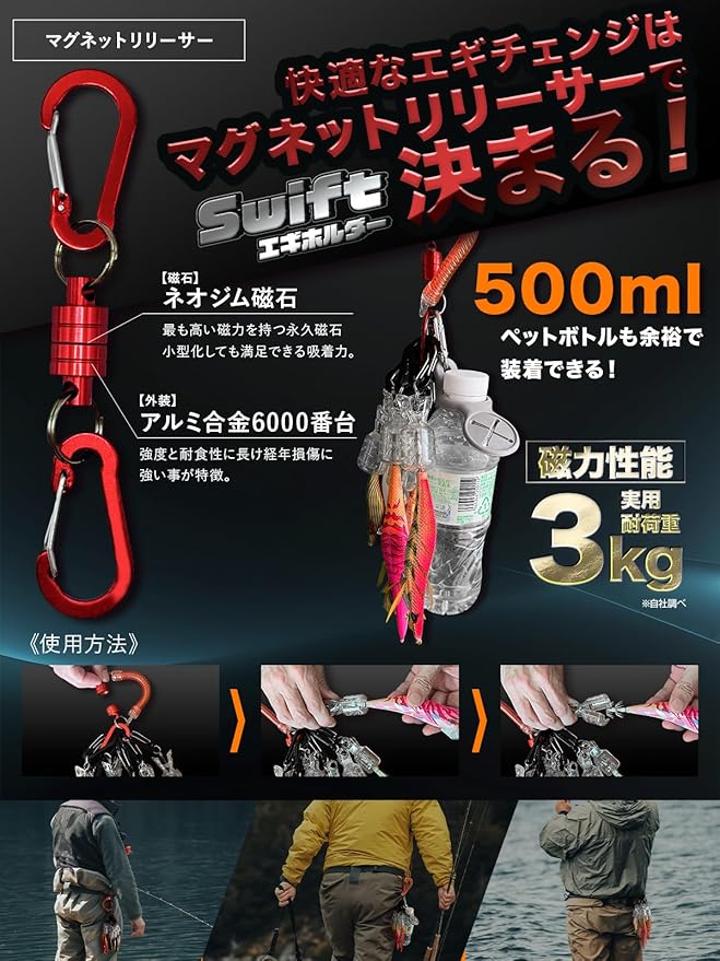 上級者はもちろん、初心者でも使いやすいマグネットの硬さは、ランガンに必須アイテム。ペットボトルをぶら下げても外れない耐荷重量3kgのローズレッドカラー、付属のペットボトルホルダーには、タオルも装着可能です。